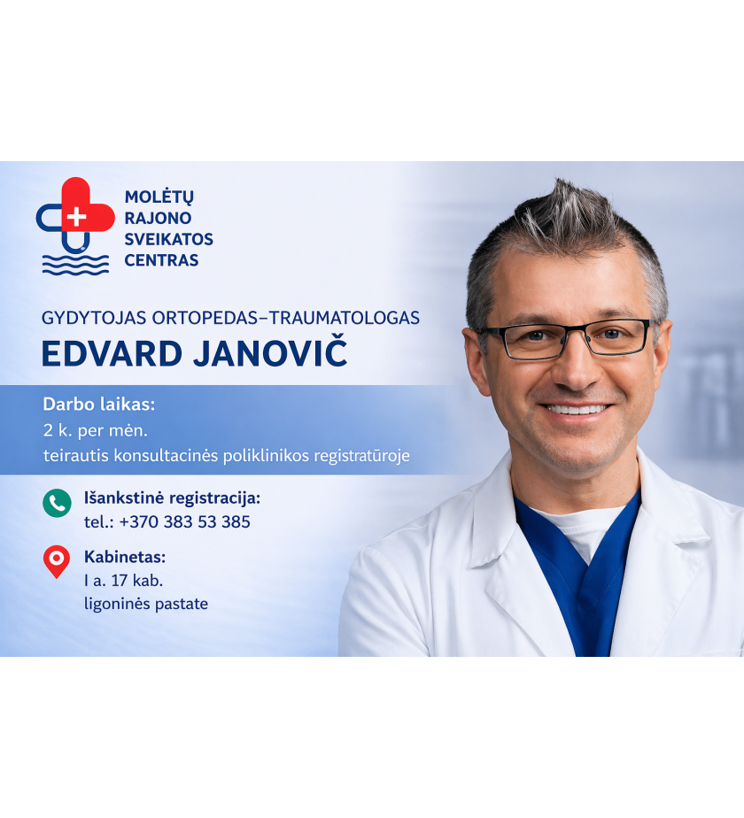 Darbo laikas: konsultacijos vyksta 2 kartus per mėnesį (dėl tikslaus grafiko teirautis registratūroje). Vieta: I aukštas, ligoninės pastatas, 17 kabinetas. Registracija: Konsultacinės poliklinikos registratūroje ☎️ +370 383 53 385 Kabineto telefonas: ☎️ +370 383 44 282