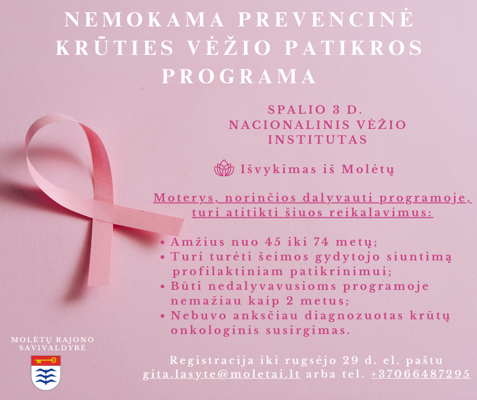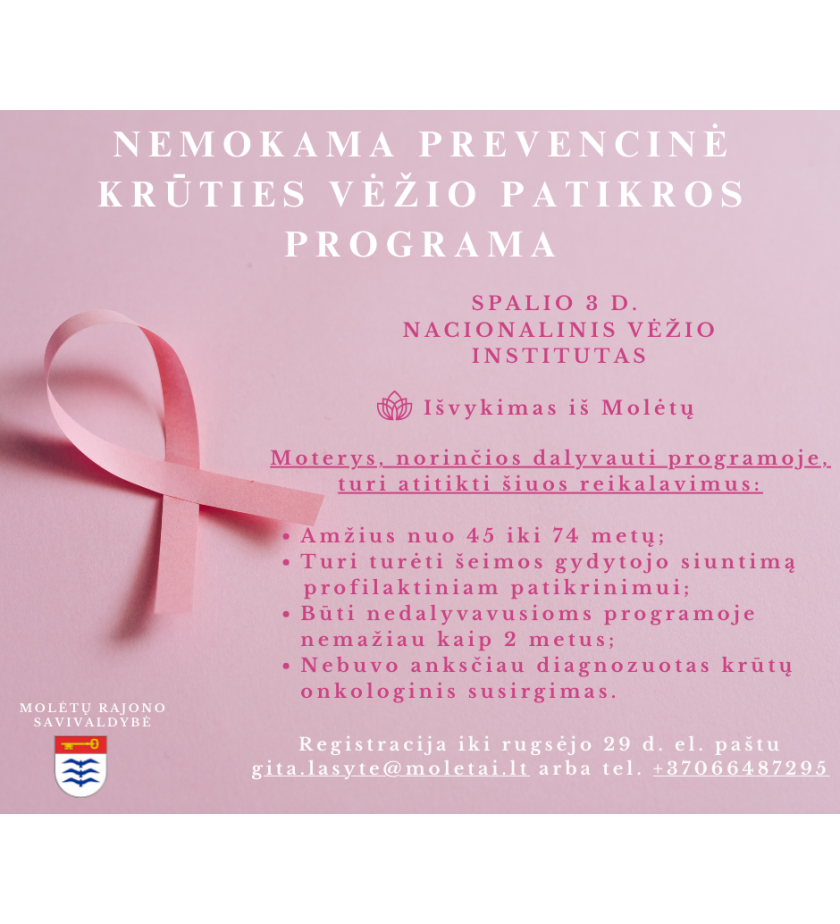 Atkreipiame dėmesį, jog kviečiamos nuo 45 iki 74 metų Lietuvos Respublikos pilietės gyvenančios Molėtų rajono savivaldybėje ir nei karto nesirgusios krūtų vėžiu bei nesitikrinusios 2 metus.