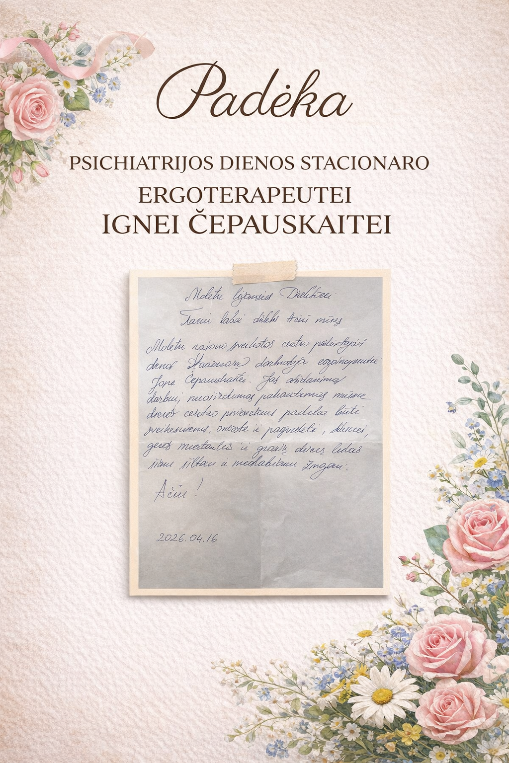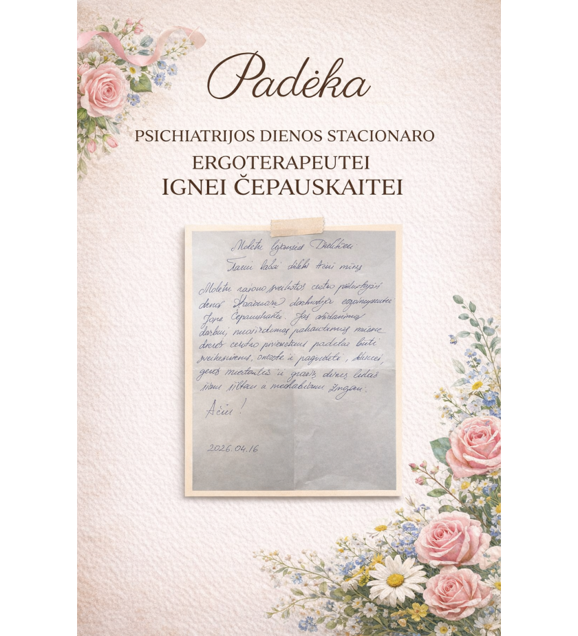 Padėka Psichiatrijos dienos stacionaro ergoterapeutei Ignei Čepauskaitei